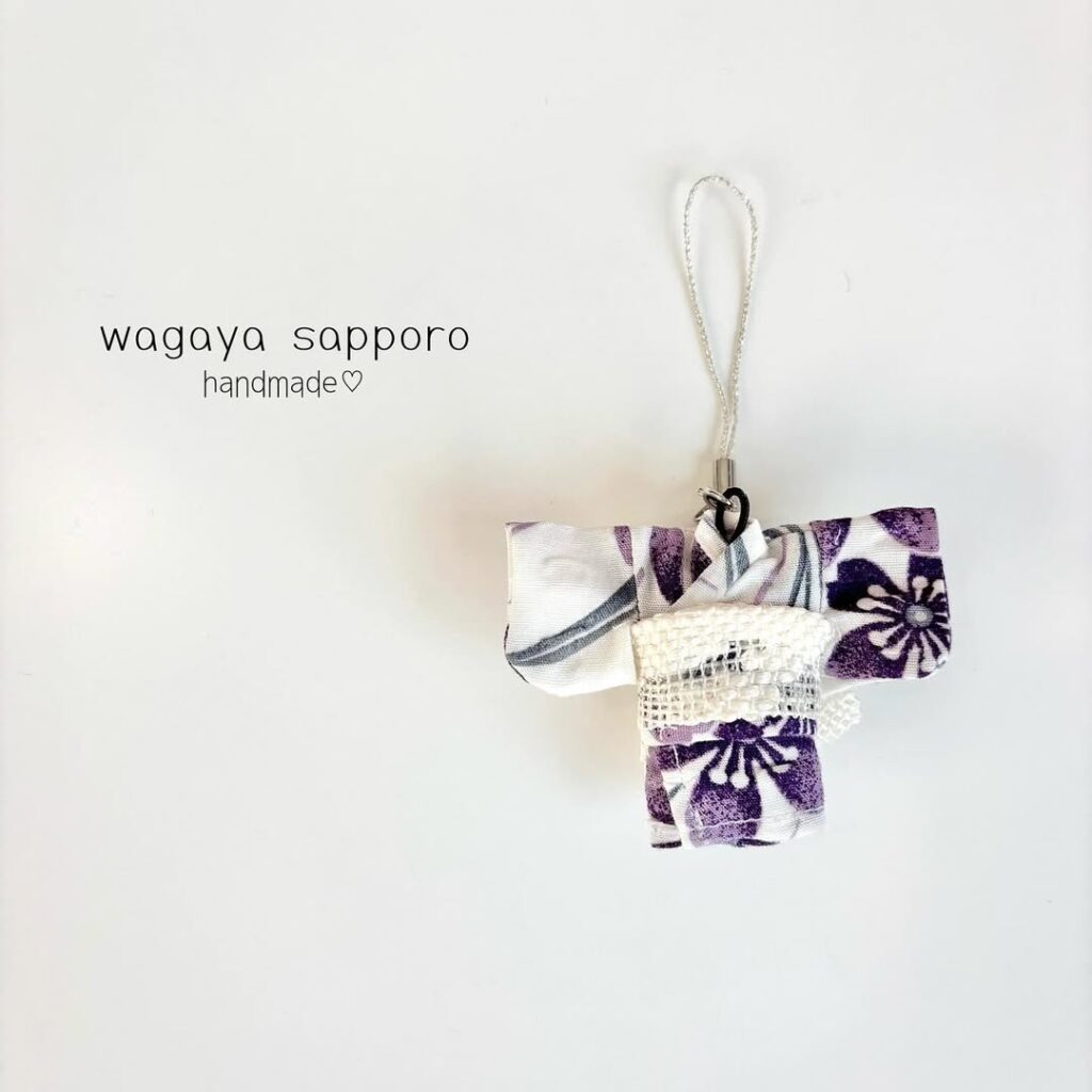 浴衣生地と夏帯を使用して作った、夏らしいミニ着物ストラップが出来ました。