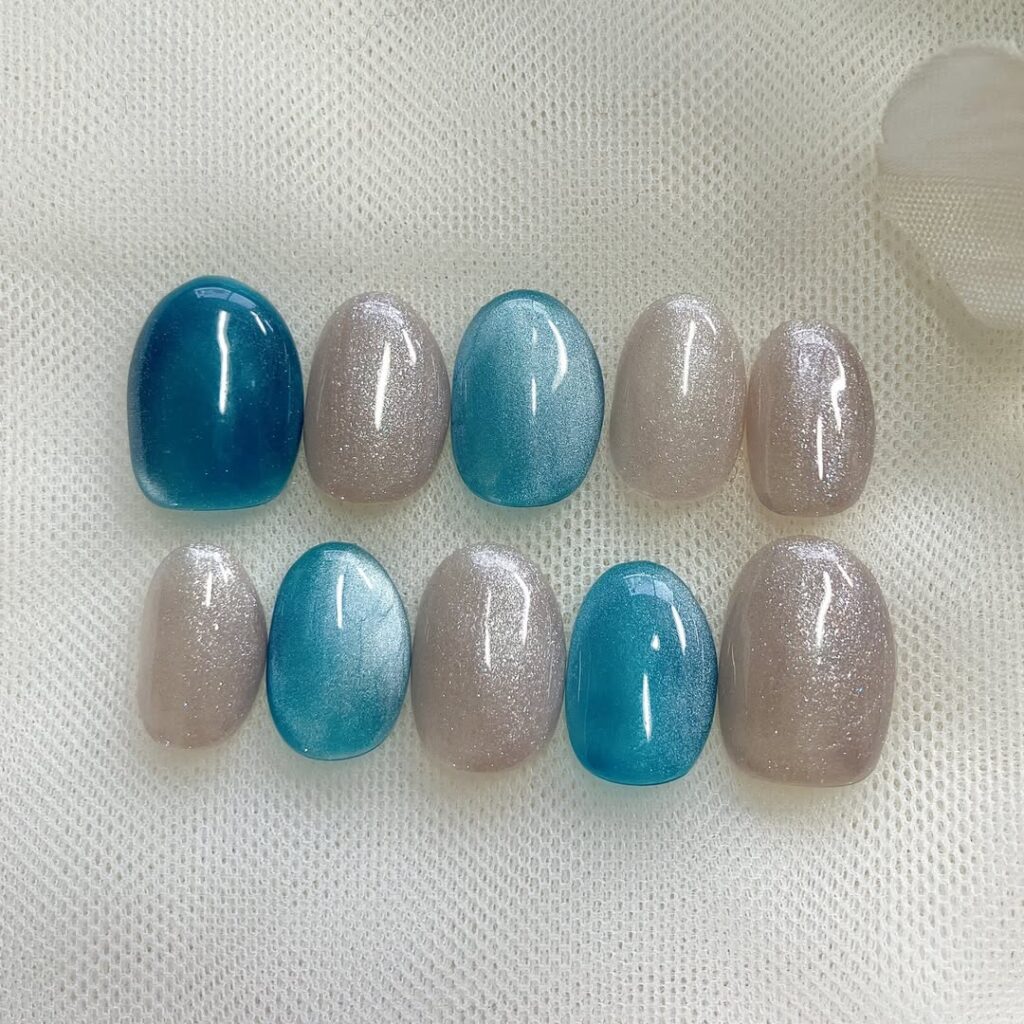 澄み切った冬の空を思わせる、ブルーカラーの微粒子マグネットネイルと、上品な輝きを放つフローズンシルバーを組み合わせた、透明感あふれるネイルチップです。
