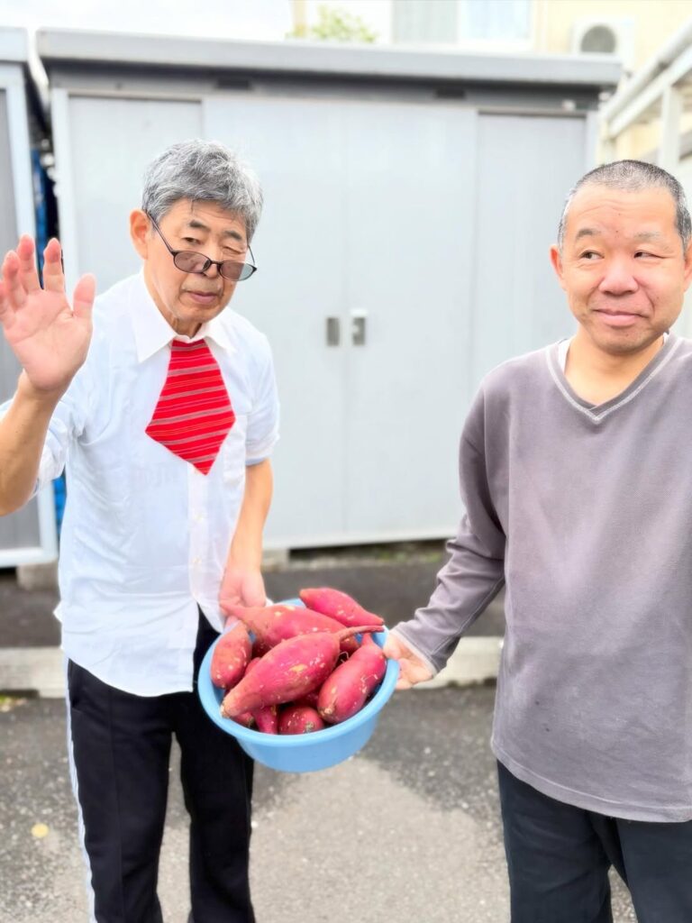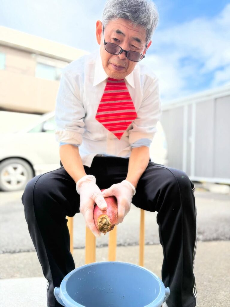 先日、掘ったさつまいもを洗いました。ワイシャツを着て、職員が即席で作った短太ネクタイとメガネをつけて