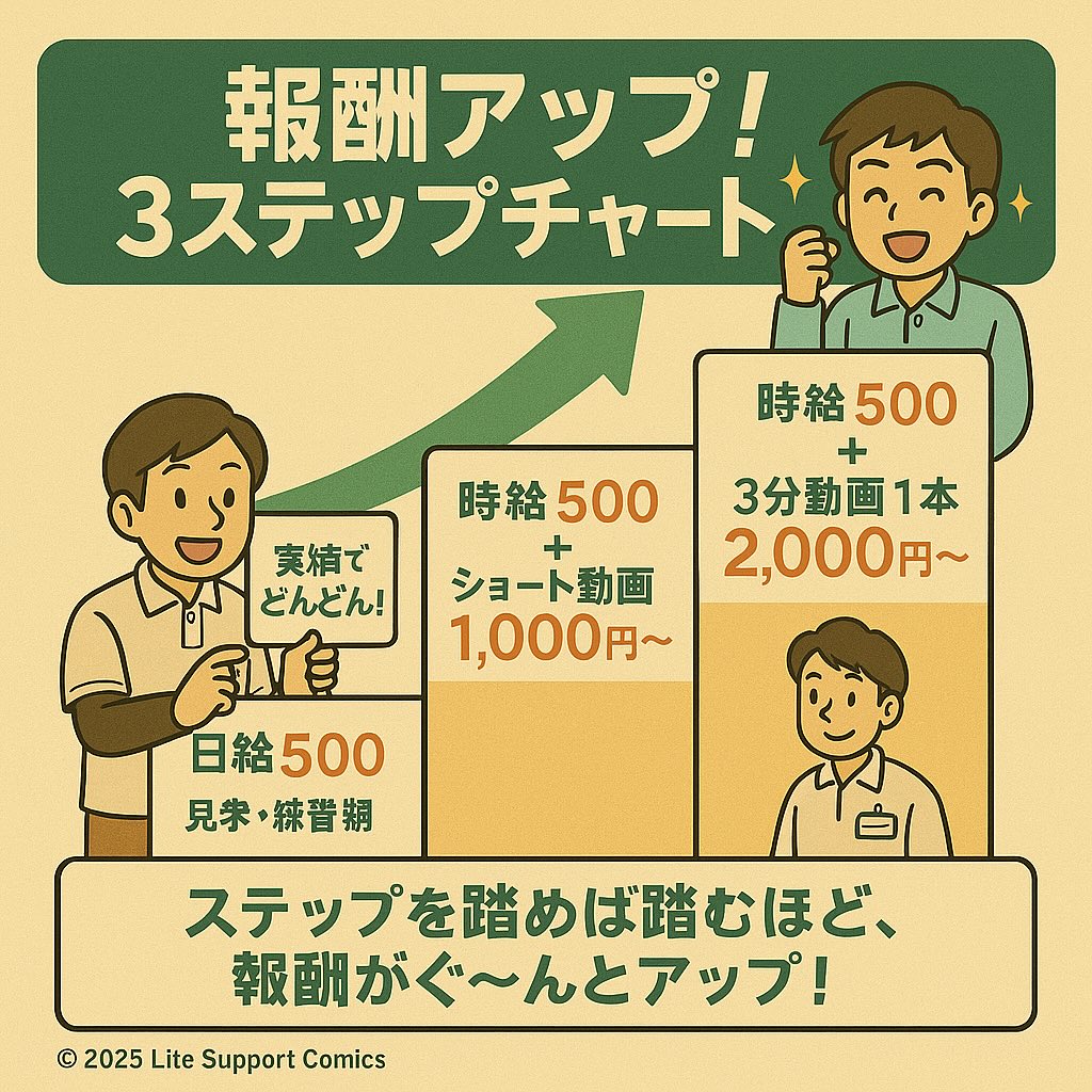 ショート1本 1,000円〜/3分動画 2,000円〜 とグングン昇給!